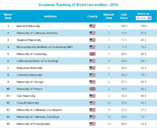 Це - шанхайський рейтинг унівеситетів: http://www.arwu.org/ Його створили в Китаї аби тверезо оцінити місце китайських університетів у світі і покращити їх, спираючись на вивірені показники.